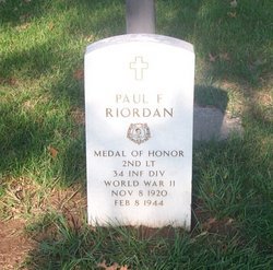 For conspicuous gallantry and intrepidity above and beyond the call of duty. In the attack on the approaches to the city of Cassino on 3 February 1944, 2d Lt. Riordan led one of the assault platoons. Attacking Hill 175, his command was pinned down by enemy machine-gun fire from the hill and from a pillbox about 45 yards to the right of the hill. In the face of intense fire, 2d Lt. Riordan moved out in full view of the enemy gunners to reach a position from where he could throw a hand grenade into the pillbox. Then, getting to his knees, he hurled the grenade approximately 45 yards, scoring a direct hit. The grenade killed one and wounded the other two Germans in the nest and silenced the gun. Another soldier then cleaned out the enemy pillboxes on the hill itself, and the company took its objective. Continuing the assault into Cassino itself on 8 February 1944, 2d Lt. Riordan and his platoon were given the mission of taking the city jailhouse, one of the enemy’s several strongpoints. Again 2d Lt. Riordan took the lead and managed to get through the ring of enemy fire covering the approaches and reached the building. His platoon, however, could not get through the intense fire and was cut off. Second Lt. Riordan, aware that his men were unable to follow, determined to carry on singlehandedly, but the numerically superior enemy force was too much for him to overcome, and he was killed by enemy small-arms fire after disposing of at least two of the defenders. Second Lt. Riordan’s bravery and extraordinary heroism in the face of almost certain death were an inspiration to his men and exemplify the highest traditions of the U.S. Armed Forces.